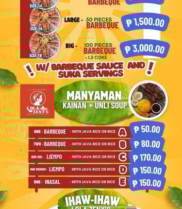At Lola Zeny's BBQ, we specialize in authentic ihaw ihaw cuisine, bringing you the rich flavors of grilled dishes that celebrate our culinary heritage.